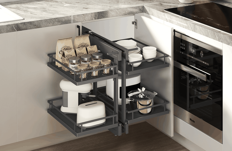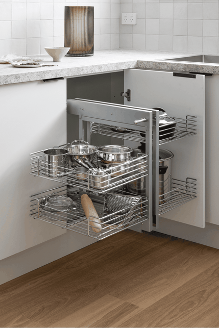 Maximise hard-to-reach spaces with our range of pullout baskets. With cleverly designed baskets, they make it easy to keep kitchen storage neatly organised, in both standard and corner base cabinets. You’ll have full access to your pots and pans – no more digging around in dark corners!