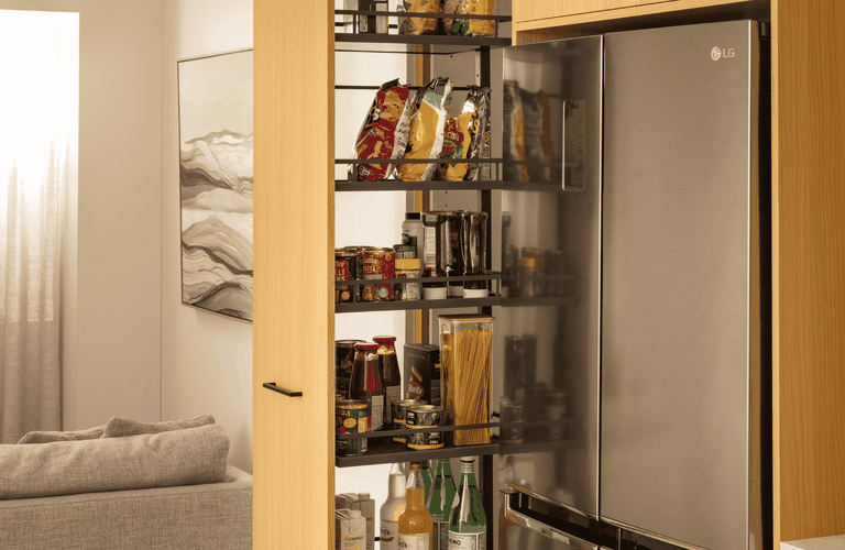 Our easy-to-install pullout pantries add a refined, high-end touch to any kitchen. Practical pullouts and easy access shelving make the entire pantry visible, so you can spend less time searching and more time to enjoy cooking. From weeknight dinners to weekend baking, everything is right where you need it.