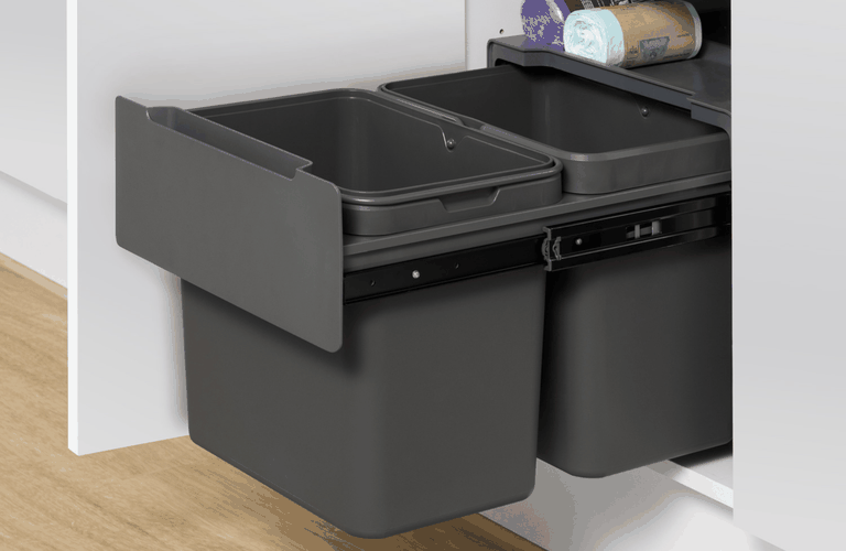 Our integrated bins tuck neatly behind closed doors, reclaiming valuable floor space while keeping odours discreetly contained. All kaboodle waste bins include door mount hardware, so you can now open the cabinet and have the bin slide forward in one smooth motion!